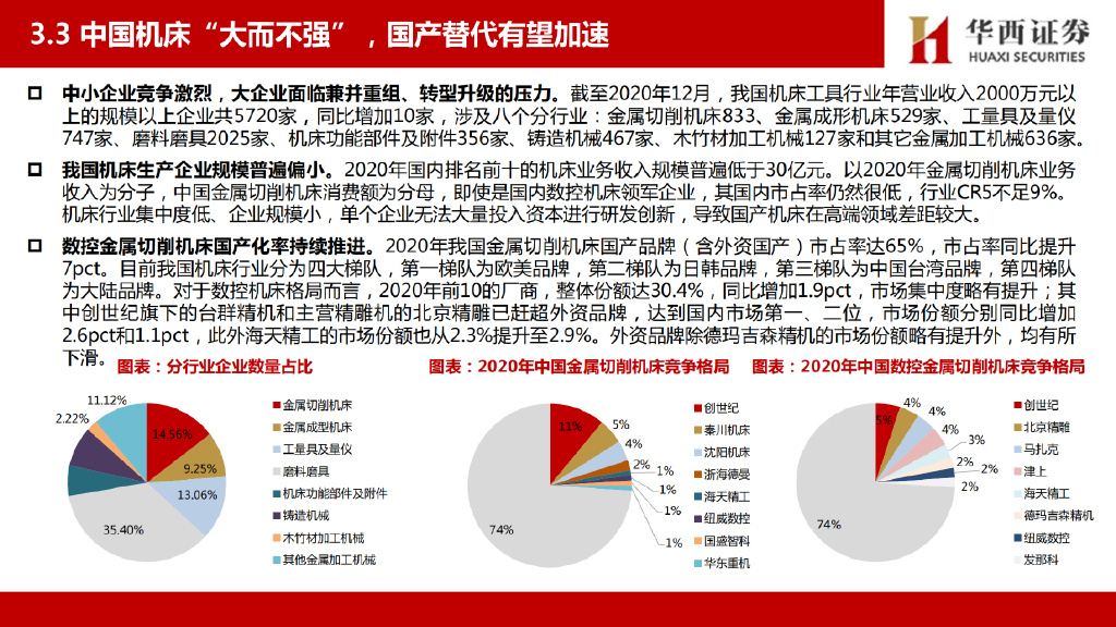 中小企业竞争激烈,大企业面临兼并重组、转型升级的压力。截至2020年12月,我国机床工具行业年营业收入2000万元以 上的规模以上企业共5720家,同比增加10家,涉及八个分行业:金属切削机床833、金属成形机床529家、工量具及量仪747家、磨料磨具2025家、机床功能部件及附件356家、铸造机械467家、木竹材加工机械127家和其它金属加工机械636家。我国机床生产企业规模普遍偏小。2020年国内排名前十的机床业务收入规模普遍低于30亿元。以2020年金属切削机床业务收入为分子,中国金属切削机床消费额为分母即使是国内数控机床领军企业,其国内市占率仍然很低,行业CR5不足9%。机床行业集中度低、企业规模小,单个企业无法大量投入资本进行研发创新,导致国产机床在高端领域差距较大。
