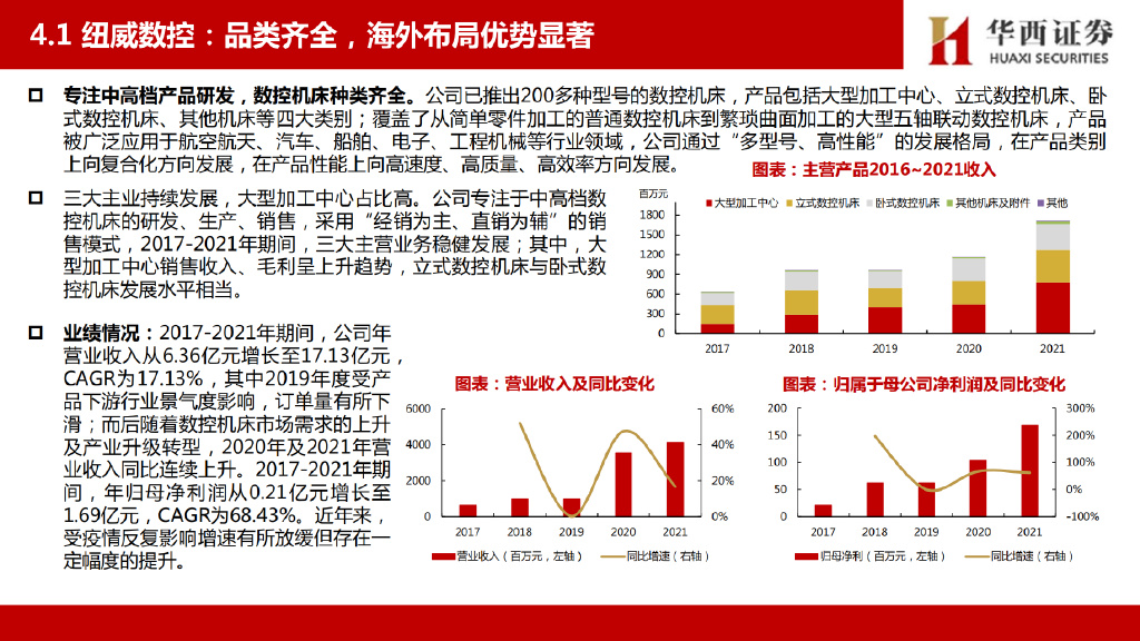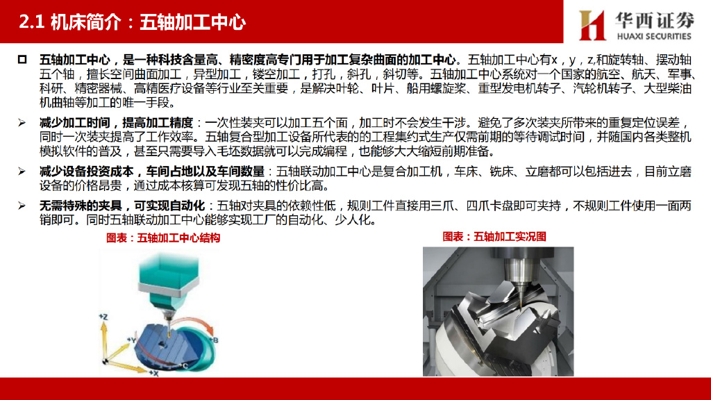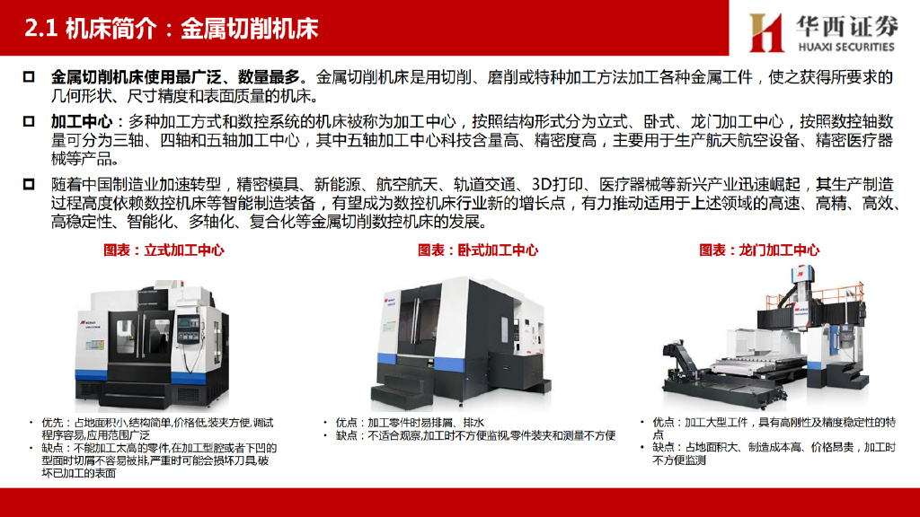 金属切削机床使用最广泛、数量最多。金属切削机床是用切削、磨削或特种加工方法加工各种金属工件,使之获得所要求的 几何形状、尺寸精度和表面质量的机床。 加工中心:多种加工方式和数控系统的机床被称为加工中心,按照结构形式分为立式、卧式、龙门加工中心,按照数控轴数 量可分为三轴、四轴和五轴加工中心,其中五轴加工中心科技含量高、精密度高,主要用于生产航天航空设备、精密医疗器 械等产品。 随着中国制造业加速转型,精密模具、新能源、航空航天、轨道交通、3D打印、医疗器械等新兴产业迅速崛起,其生产制造 过程高度依赖数控机床等智能制造装备,有望成为数控机床行业新的增长点,有力推动适用于上述领域的高速、高精、高效、 高稳定性、智能化、多轴化、复合化等金属切削数控机床的发展。