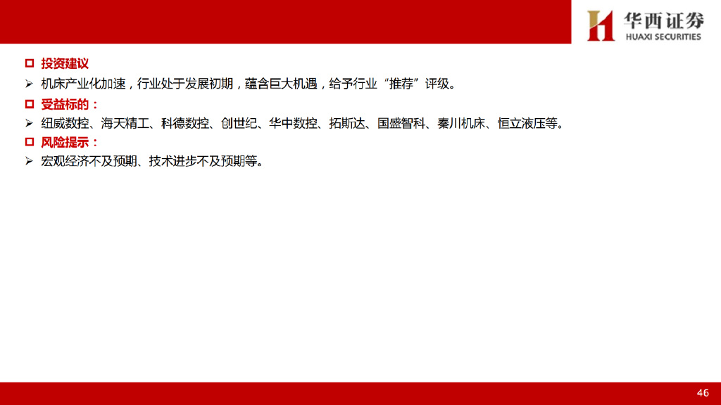 我国是机床大国格局分散,进口替代&民营崛起是趋势。产业集中度低竞争格局较为分散,企业规模较小,但行业优势企业正逐渐扩大市场份额,进口替代持续。国内机床在产品水平、加工精度、加工技术、制 造技术、数控系统、可靠性、使用寿命与海外存在一定差距。随着近年来产业结构的调整,民营企业成为我国机床市场的中坚力量,迎来重大发展机遇。