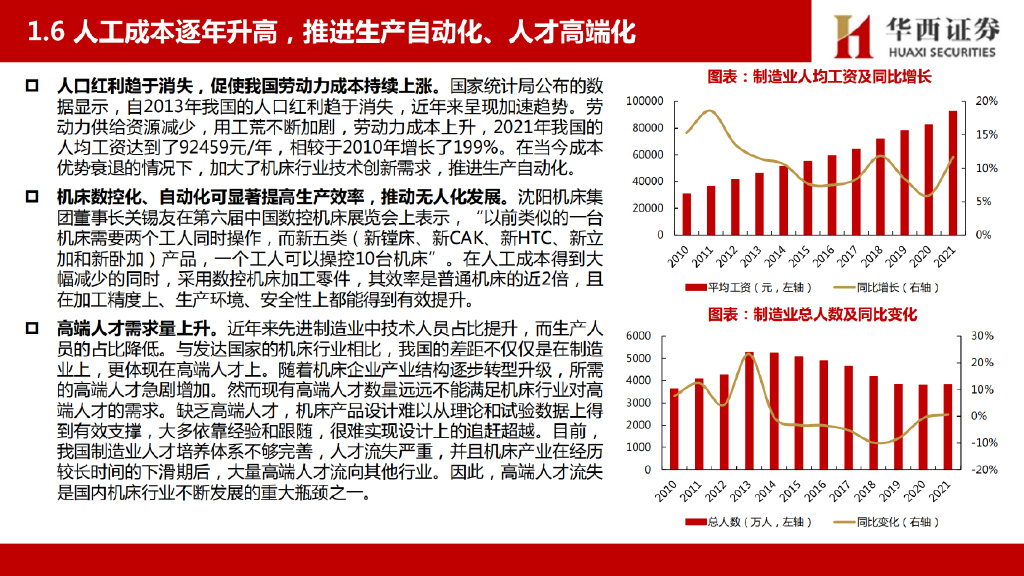 人口红利趋于消失,促使我国劳动力成本持续上涨。国家统计局公布的数 据显示,自2013年我国的人口红利趋于消失,近年来呈现加速趋势。劳 动力供给资源减少,用工荒不断加剧,劳动力成本上升,2021年我国的 人均工资达到了92459元/年,相较于2010年增长了199%。在当今成本 优势衰退的情况下,加大了机床行业技术创新需求,推进生产自动化。 机床数控化、自动化可显著提高生产效率,推动无人化发展。沈阳机床集 团董事长关锡友在第六届中国数控机床展览会上表示,“以前类似的一台 机床需要两个工人同时操作,而新五类(新镗床、新CAK、新HTC、新立 加和新卧加)产品,一个工人可以操控10台机床”。在人工成本得到大 幅减少的同时,采用数控机床加工零件,其效率是普通机床的近2倍,且 在加工精度上、生产环境、安全性上都能得到有效提升。