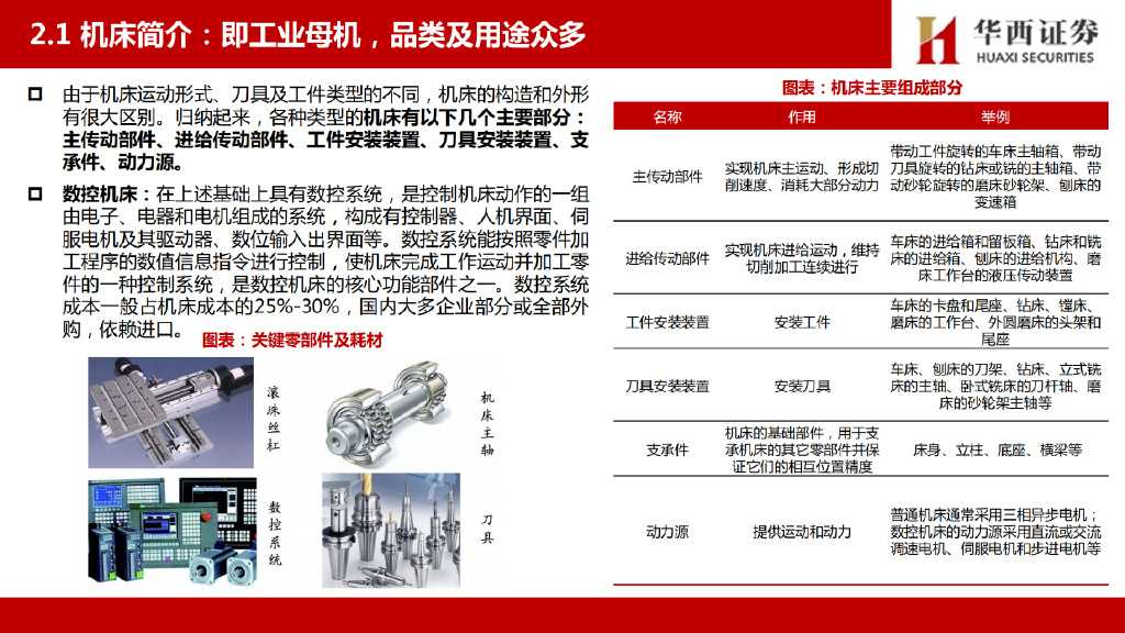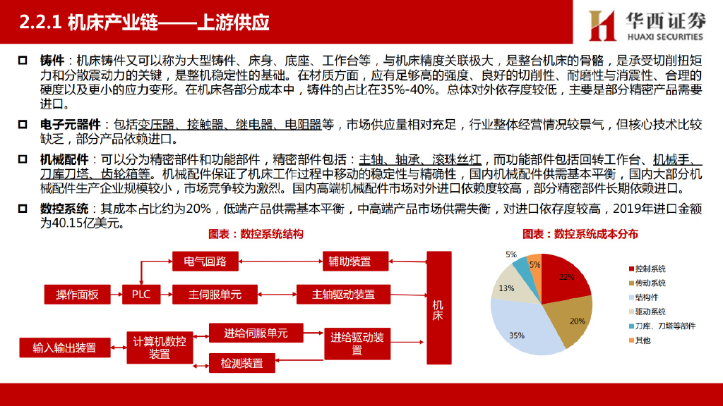 机械配件:可以分为精密部件和功能部件,精密部件包括:主轴、轴承、滚珠丝杠,而功能部件包括回转工作台、机械手、 刀库刀塔、齿轮箱等。机械配件保证了机床工作过程中移动的稳定性与精确性,国内机械配件供需基本平衡,国内大部分机 械配件生产企业规模较小,市场竞争较为激烈。国内高端机械配件市场对外进口依赖度较高,部分精密部件长期依赖进口。 数控系统:其成本占比约为20%,低端产品供需基本平衡,中高端产品市场供需失衡,对进口依存度较高,2019年进口金额 为40.15亿美元。