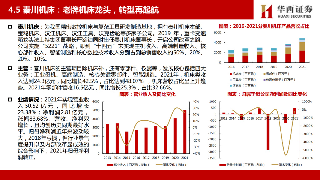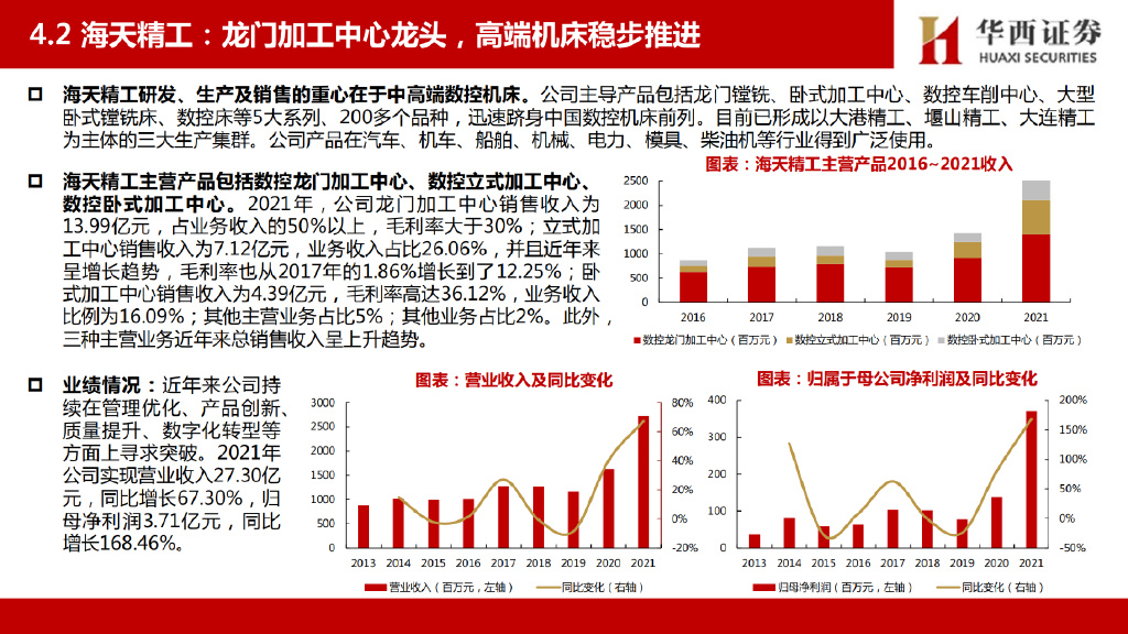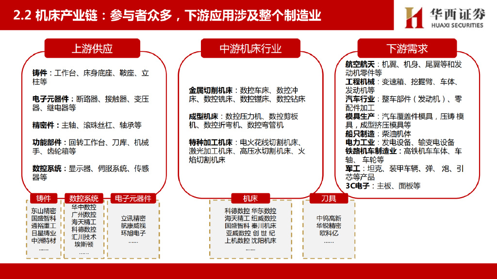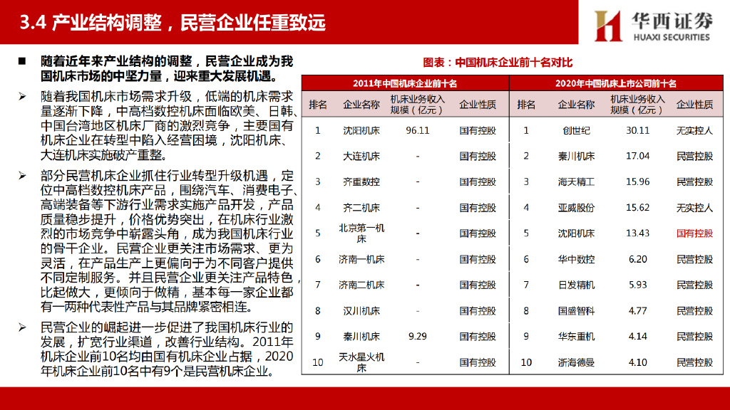 部分民营机床企业抓住行业转型升级机遇,定 位中高档数控机床产品,围绕汽车、消费电子、 高端装备等下游行业需求实施产品开发,产品 质量稳步提升,价格优势突出,在机床行业激 烈的市场竞争中崭露头角,成为我国机床行业 的骨干企业。民营企业更关注市场需求、更为 灵活,在产品生产上更偏向于为不同客户提供 不同定制服务。并且民营企业更关注产品特色, 比起做大,更倾向于做精,基本每一家企业都 有一两种代表性产品与其品牌紧密相连。 民营企业的崛起进一步促进了我国机床行业的 发展,扩宽行业渠道,改善行业结构。2011年 机床企业前10名均由国有机床企业占据,2020 年机床企业前10名中有9个是民营机床企业。
