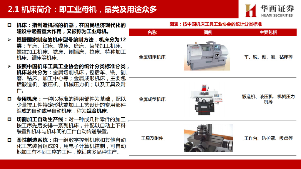 机床:指制造机器的机器,在国民经济现代化的 建设中起着重大作用,又被称为工业母机。 根据国家制定的机床型号编制方法,机床分为12 类:车床、钻床、镗床、磨床、齿轮加工机床、 螺纹加工机床、铣床、刨插床、拉床、特种加工 机床、锯床等机床。 按照中国机床工具工业协会的统计分类标准分类, 机床总共分为:金属切削机床,包括车、铣、刨、 磨、钻床、加工中心等;金属成形机床,主要包 括锻造机、液压机、机械压力机;以及工具及附 件。