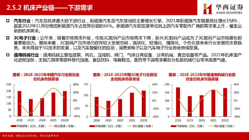汽车是机床产业链下游占比最大的行业,传统汽车转型新能源趋势明显,新能源汽车成为风口。因品牌汽车在我国销量下降, 诸多传统汽车制造商纷纷开始研发新能源汽车。根据中国汽车工业协会统计分析,新能源汽车产量快速增长原因在于,市场 已从政策驱动转向市场拉动,呈现出市场规模、发展质量双提升的良好发展局面。2022年,全国汽车产量为2702.10万辆, 同比增长3.4%;新能源汽车产量达705.8万辆,同比增长100%。汽车产业产能的扩大直接带动数控机床的销量,并且新能源 汽车车体结构的变化也需要一定程度上对机床进行替换升级。