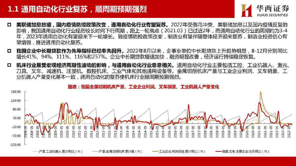 我国企业中长期贷款作为先导指标已经率先回升。2022年8月以来,企事业单位中长期贷款上升趋势明显,8-12月分别同比 增长41%、94%、111%、116%和257%。企业中长期贷款增速加快,融资明显改善,经济运行持续稳定恢复。 机床行业易受宏观经济周期性波动的影响,与通用自动化行业息息相关。通用自动化行业主要包括工控、工业机器人、激光、 刀具、叉车、减速机、注塑机、数控机床、工业气体和其他通用设备等。金属切削机床产量与工业企业利润、叉车销量、工 业机器人产量变化基本一致,通用自动化的复苏使机床行业顺周期预期强烈。