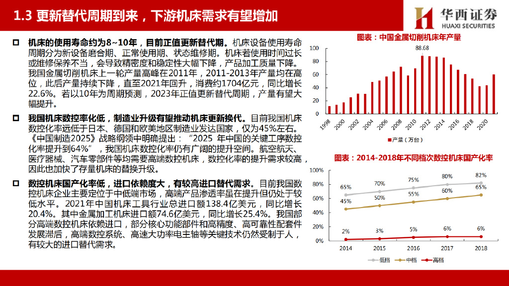 机床的使用寿命约为8~10年,目前正值更新替代期。机床设备使用寿命 周期分为新设备磨合期、正常使用期、状态维修期。机床若使用时间过长 或维修保养不当,会导致精密度和稳定性大幅下降,产品加工质量下降。 我国金属切削机床上一轮产量高峰在2011年,2011-2013年产量均在高 位,此后产量持续下降,直至2021年回升,消费约1704亿元,同比增长 22.6%。若以10年为周期预测,2023年正值更新替代周期,产量有望大 幅提升。