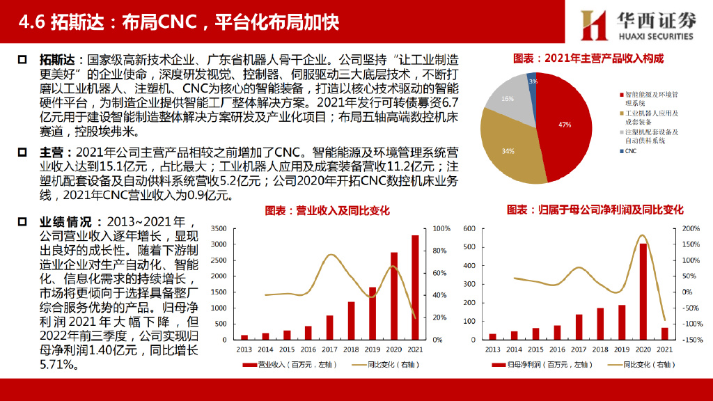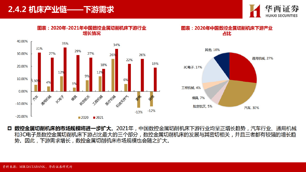 3C电子行业:近年来,随着市场需求升级,传统3C数码产品市场需求下降,新兴3C数码产品成为了3C数码产品市场增长的 重要驱动力。整体来看,3C数码产品市场仍存在较大发展空间,高端化、轻薄化、精简化、个性化是未来行业发展的主要趋 势。未来得益于5G技术的发展,以及汽车智能化的拉动,消费类电子以及汽车电子行业将会持续发展。 通用机械行业:通用机械主要包括泵、风机、压缩机、阀门、气体分离设备、分离机械、真空设备等产品。2021年机床国产 化进程加快,主轴刀具等零部件替代加速。食品饮料、电商物流、医药等下游需求暴涨为包装机械行业带来高景气度。