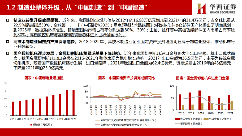 高技术制造业固定资产投资增速快。2018-2022年,高技术制造业企业固定资产投资增速明显高于制造业整体。推动机床行 业升级转型。 国产数控机床逐步发展,金属切削机床贸易逆差呈下降趋势。近年来我国切削机床进口金额略大于出口金额。就出口现状而 言,我国金属切削机床出口金额在2016-2021年整体表现为稳步增长趋势,2021年出口金额为36.5亿美元,主要为传统金属 切削机床。随着国产数控机床逐步发展,进口量略降,2021年我国进口金额为62.4亿美元。贸易逆差由2016年的45亿美元, 下降至2021年的25.9亿美元。