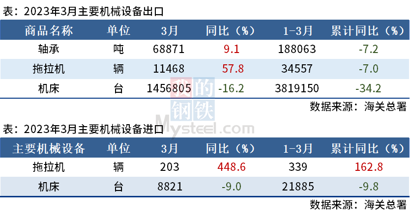 总体来看,2023年一季度,我国主要机械设备出口均出现了不同程度的下滑,但3月出口情况较前两个月明显好转。