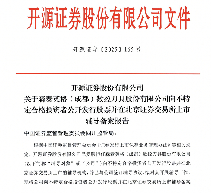 瑞财经 刘治颖 12月17日,森泰英格(成都)数控刀具股份有限公司(以下简称:森泰英格)在四川证监局完成IPO辅导备案,拟北交所上市,辅导机构为开源证券。